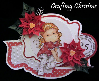 I had the image already, that of Crissy Armstrong's 'Leap of Joy' & I coloured this seasonal deer with Promarkers to match my chosen papers from Heather Jolly. Doesn't he look proud in his velvet attire? It was the cut file for my row of jingling bells to match those on the deer's festive outfit that really stretched those 'little grey cells' this week. Welding circles, ellipses, parts of ellipses & layering - just to create my jingle bells. I did, you might have noticed, also cut the word 'Joy' on the front. The holly wasn't one of my own files, but one from Cre8tive Cutz & although very tempted to make it nice & dimensional managed to restrain myself & kept it all nice & flat instead so it will go through the post more easily & cheaply. Like the snow beneath the deer's feet, the holly was then duly 'Stickled' for a nice, crisp frost.